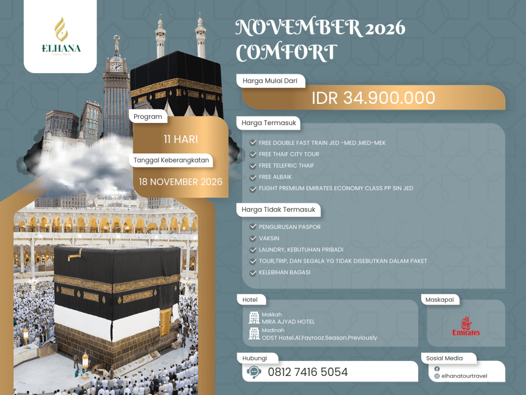 Elhana Tour and Travel berhak untuk melakukan upgrade atau perubahan hotel dan maskapai demi kenyamanan jamaah, dengan tetap mempertahankan kualitas dan standar pelayanan yang setara atau lebih baik.